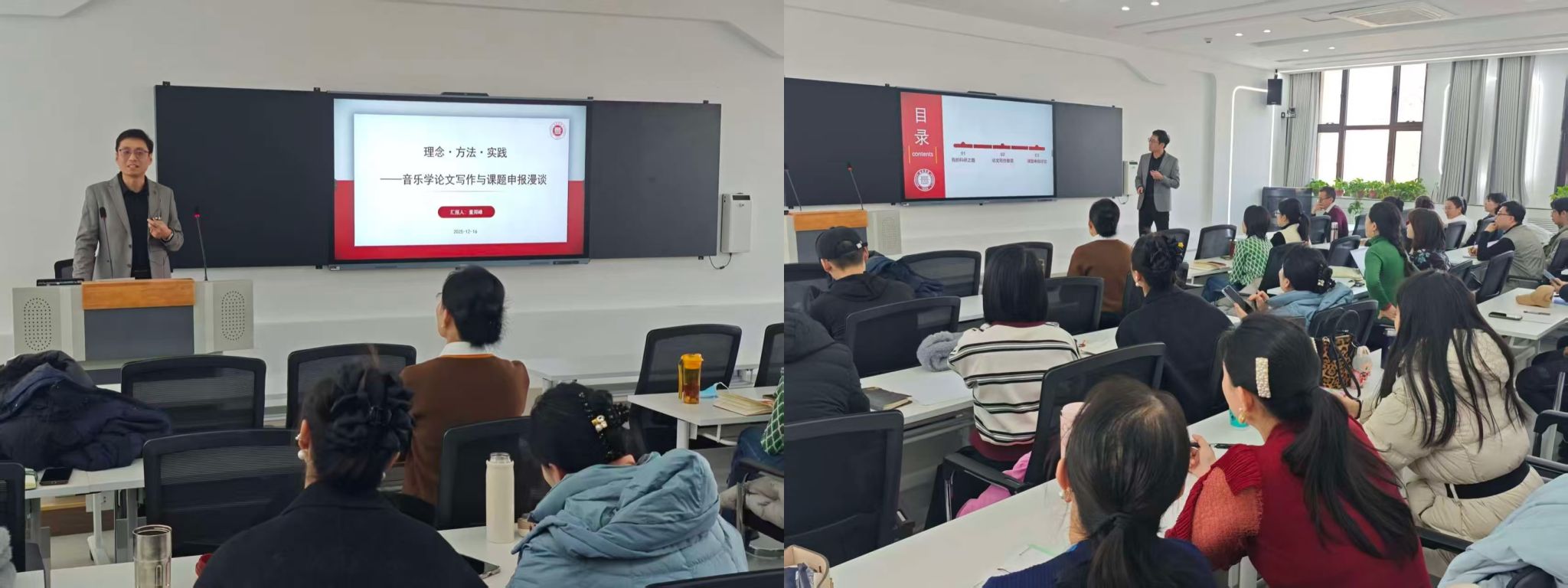 12月16日下午,我院在12号楼三层教室成功举办科研能力提升专题讲座。本次讲座由中国艺术研究院博士、长治学院音乐舞蹈系副教授董郑峰主讲,学院全体教师参会,讲座由党委副书记史宏主持。
